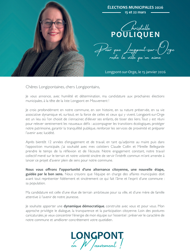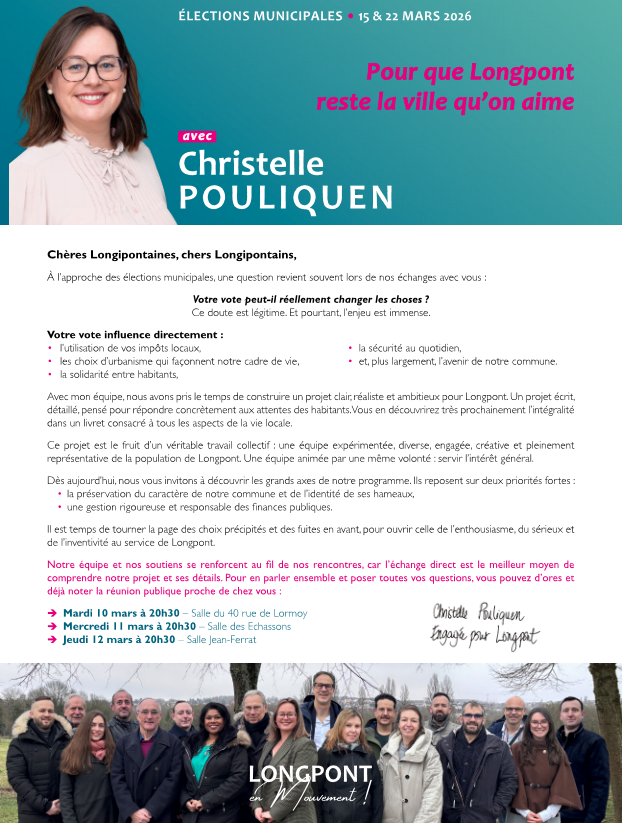 Le groupe Longpont En Mouvement représenté par 3 élus à la table du conseil souhaite au nom de toute notre équipe remercier les Longipontaines et Longipontains qui nous ont fait confiance et qui ont exprimé le souhait d’un renouvellement pour notre commune. Dans un contexte particulier, les urnes ont clairement parlé et nous acceptons le résultat et vous souhaitons pleine réussite.