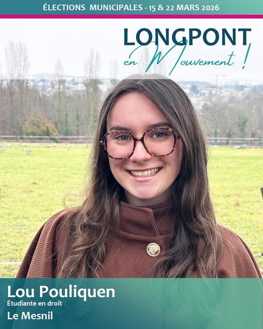 Aujourd’hui, je souhaite mettre mon énergie et ma jeunesse au service de tous les Longipontains. Je suis convaincue que l’avenir de notre commune se construit avec toutes les générations, dans le dialogue, l’écoute et l’action.